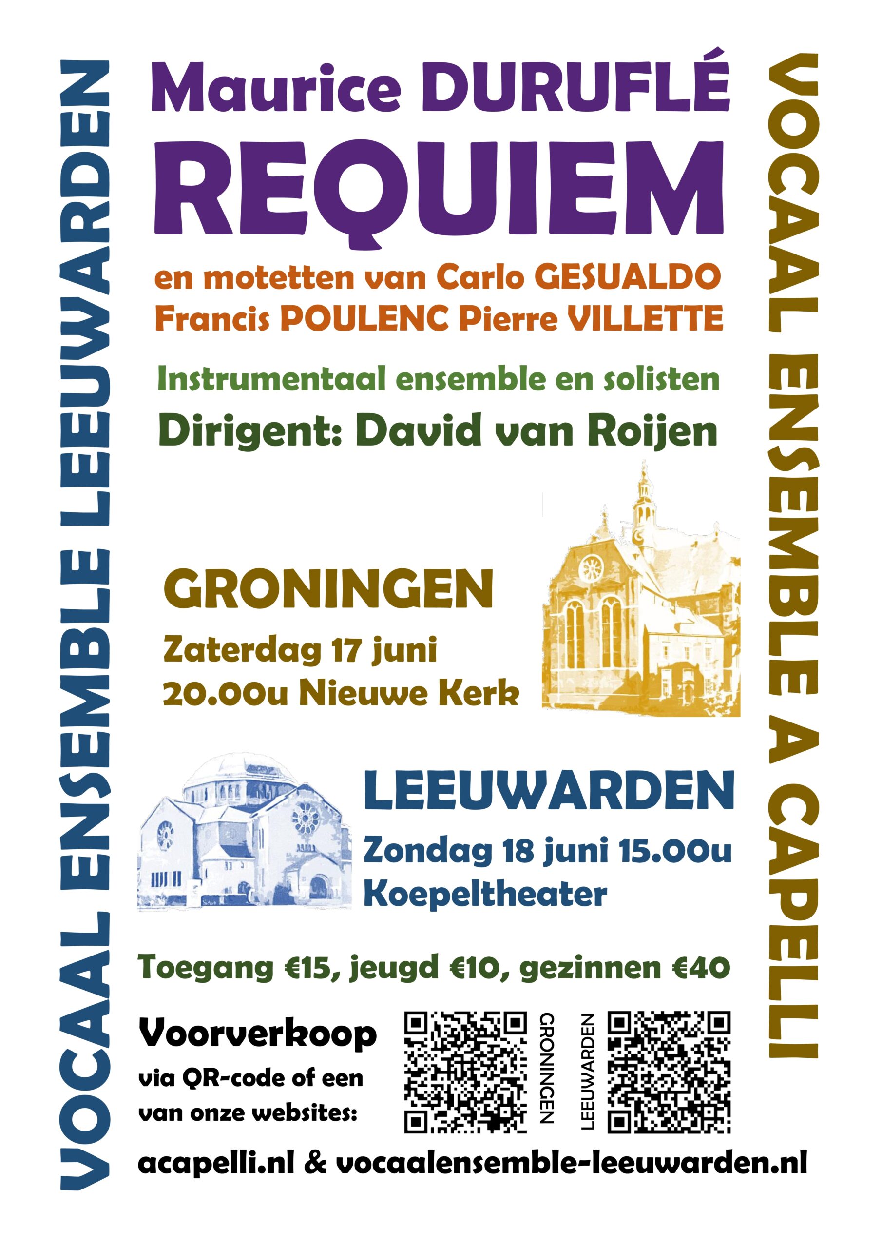 Samen met het jubilerende vocaal ensemble A Capelli zingt Vocaal Ensemble Leeuwarden het Requiem van Duruflé. Een indrukwekkend werk van rouw en troost. Dicht bij het Gregoriaanse origineel gebleven en toch onmiskenbaar modern klinkt de eeuwenoude dodenmis bij Duruflé als een persoonlijk verhaal. Uitgevoerd wordt de versie begeleid door orgel en klein orkest. Beide koren zingen naast dit hoofdwerk uit eigen repertoire. Werken van Poulenc, Gesualdo en Villette. Stuk voor stuk in hun klankwereld prachtige en soms gedurfde werken.