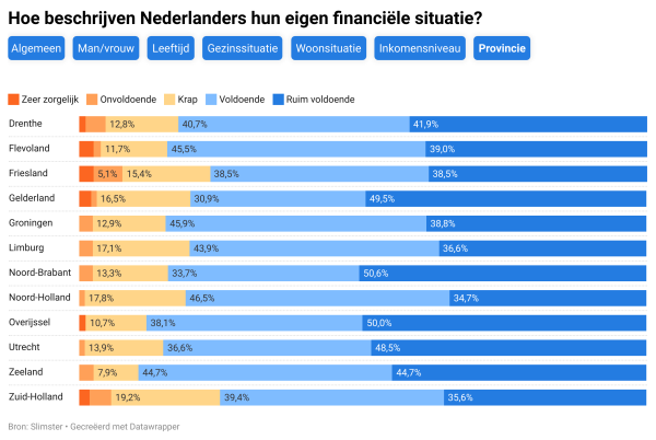 Of het nu gaat om de boodschappen, de energierekening of benzine: het leven is flink duurder geworden. Vooral in de provincies Friesland en Zuid-Holland laat zich dit voelen. Bijna een kwart van de Friezen beoordeelt de eigen financiële situatie als ‘krap’, ‘onvoldoende’ of zelfs ‘zeer zorgelijk’. Dat blijkt uit een onderzoek van vergelijkingssite Slimster, dat een representatief panel van 1054 Nederlanders ondervroeg.
