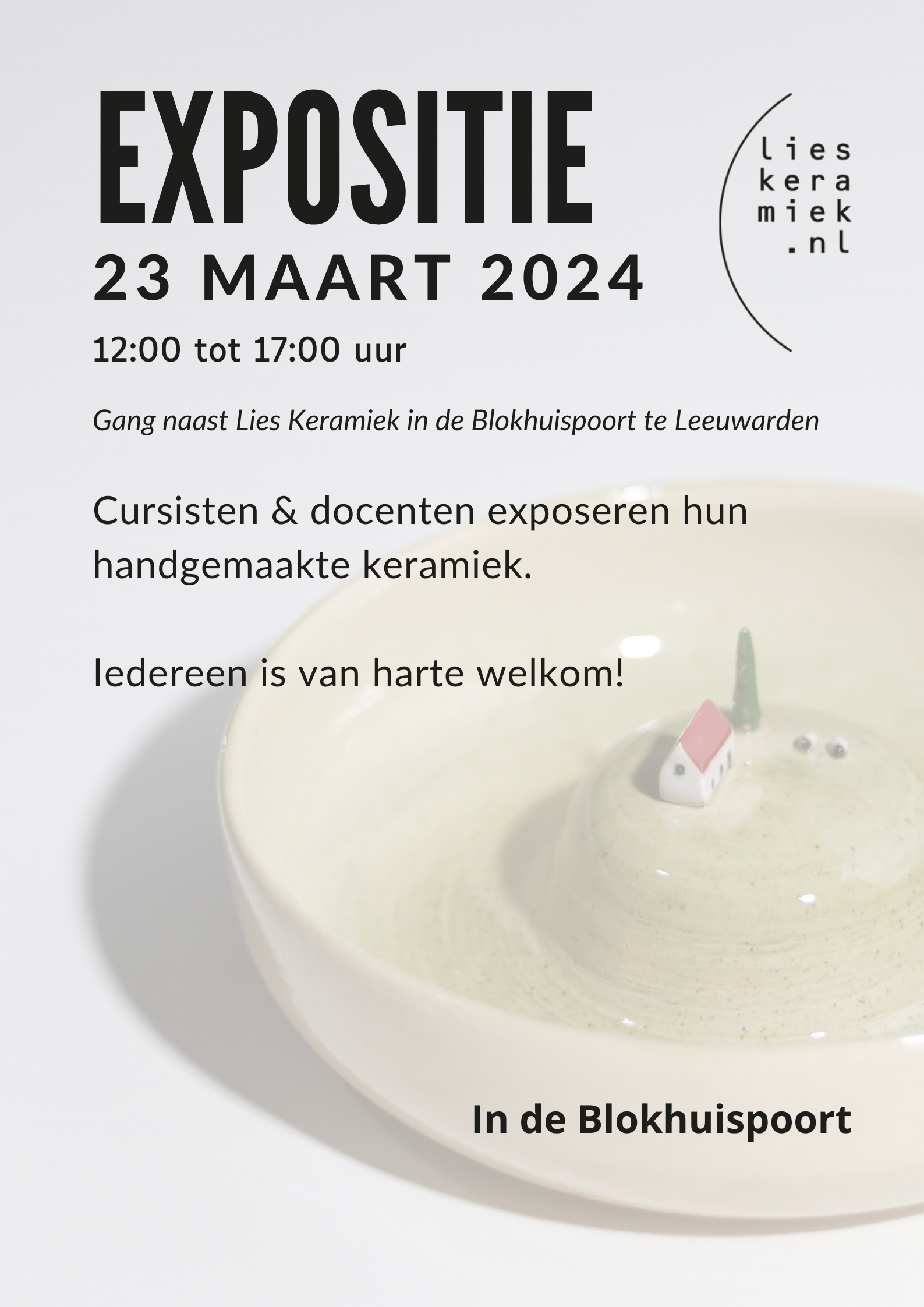 Lies Keramiek organiseert op zaterdag 23 maart van 12:00 tot 17:00 uur een expositie met het keramische handgemaakte werk van cursisten en docenten in de Blokhuispoort te Leeuwarden. Met deze expositie krijgen alle cursisten, beginners als gevorderden, de kans om hun werk aan het publiek te laten zien. En sommigen verkopen ook hun werk.
