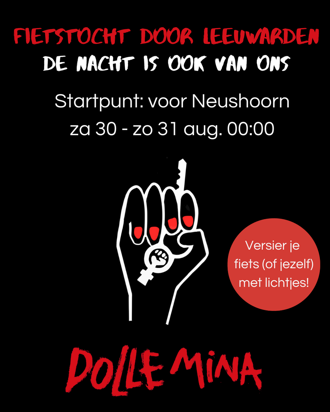 Met de slogan ‘De nacht is ook van ons’ start in de nacht van zaterdag 30 op zondag 31 augustus om klokslag 00:00 uur door heel Nederland een verlichte fietstocht vanuit uitgaanscentra naar onveilige plekken. “Dolle Mina roept iedereen op, vrouwen én mannen, jong en oud, om mee te fietsen om eens en voor altijd duidelijk te maken dat we onveilige straten en onveilig gedrag in Nederland niet langer accepteren,” aldus Femke Molenaar, woordvoerder bij Dolle mina Friesland.