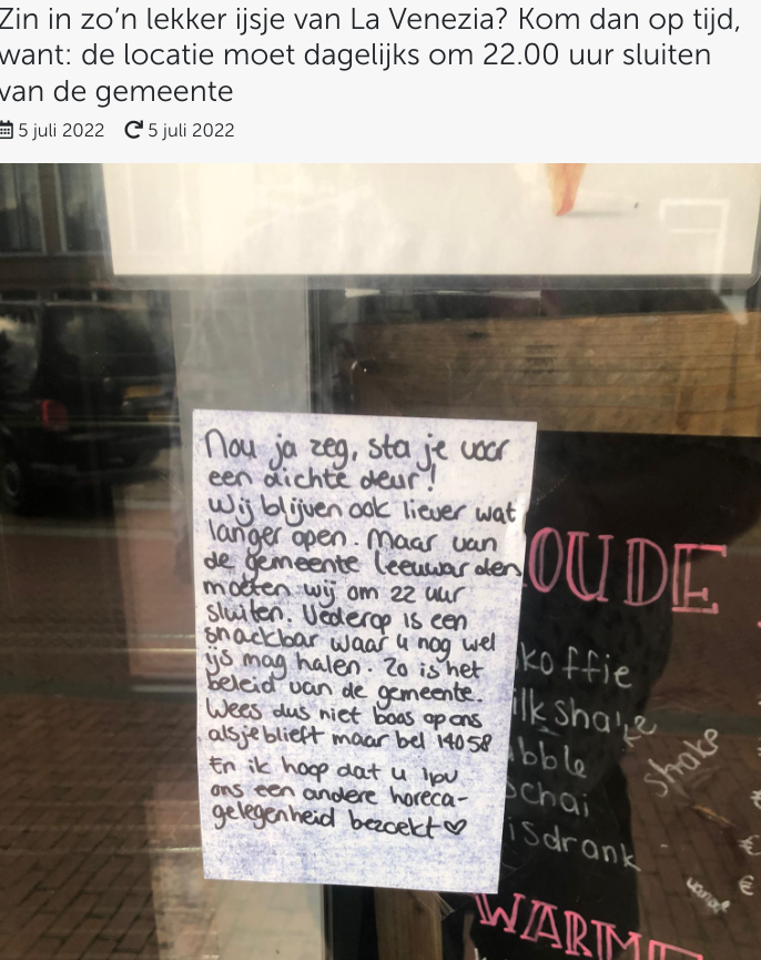 Earst in oantal saken op in rychje: op 5 july waard it boppesteande artikel publisearre. Under oaren op sosjale media wie der ferûntwaardiging grut mar ek by de iissalon sels wie hja net bliid. Sa docht wol bliken út de toan fan it bryfke dat op de doar plakt is (sjoch ôfbielding) mar ek yn it petear dat ûnderskreaune mei ien fan de meiwurkers fan de saak hie waard dit befêstige. Sy ervare dit sels as ‘ûndernimmertsje peste’.