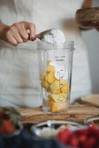 Doe alle ingrediënten in de beker van een blender. Pureer alles tot een gladde puree. Verdun de smoothie eventueel met meer melk of koolzuurhoudend water.