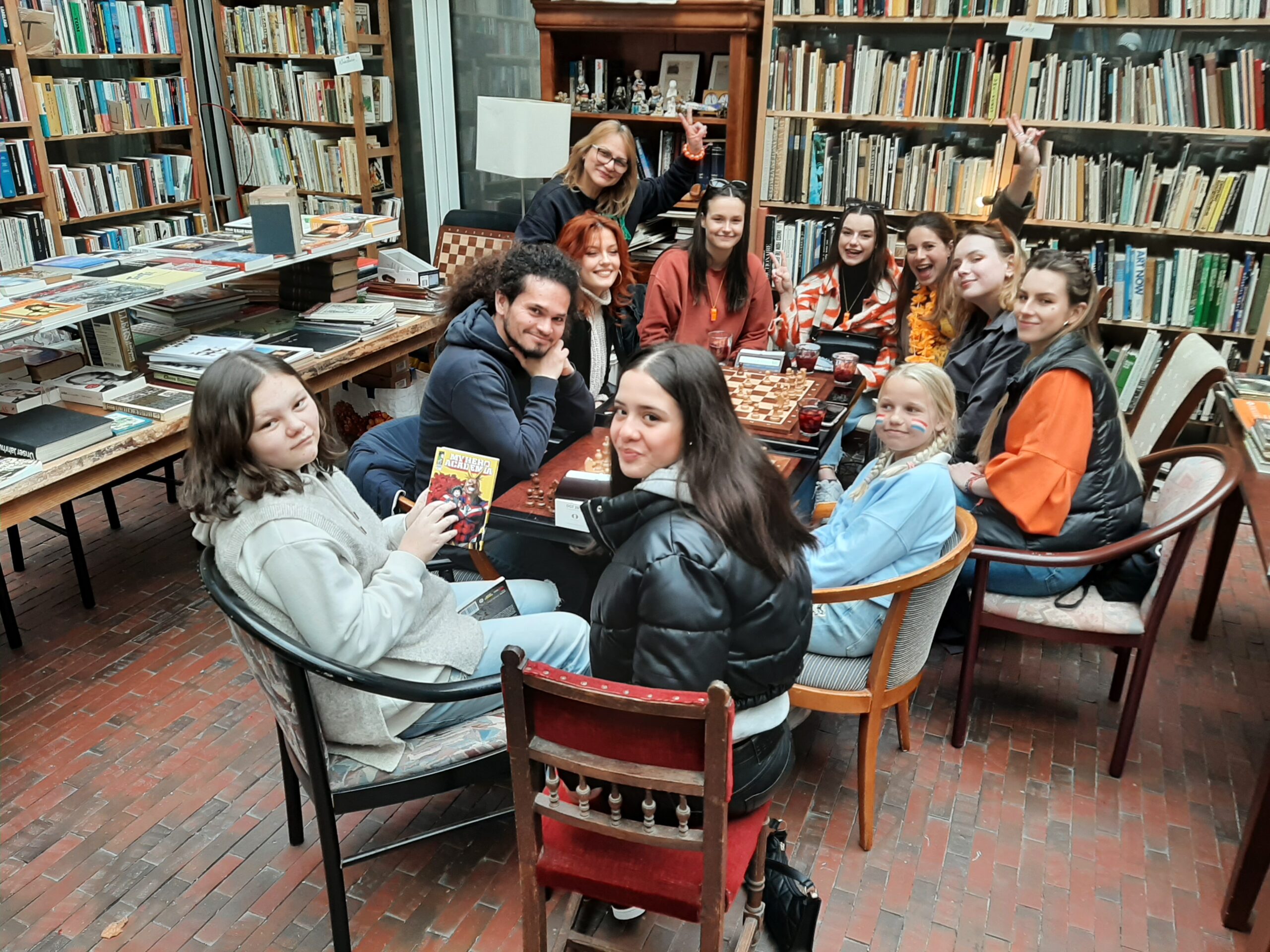 • Of er hier geschaakt wordt? Nee hoor, zeg ik. Maar ik vind het zo leuk staan, die schaakborden op de tafels