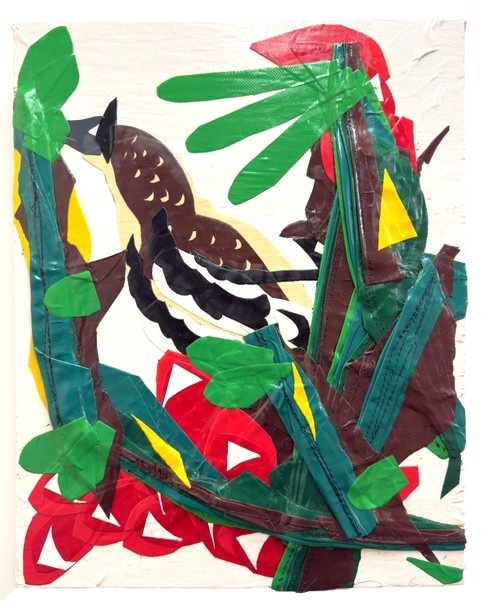 Klein Velderman (Deventer, 1979) creëert vanuit deconstructie. Hij zoekt betekenis door zijn materiaal – industrieel zeildoek – letterlijk in stukken te hakken en deze ‘bouwstenen’ te verwerken en herordenen tot iets nieuws. Hij verknipt of vernaait het materiaal, versmelt het tot een soort verf duwt het ten slotte met kracht op een houten paneel uit. Terwijl hij zijn schaar door het stugge doek beweegt zoekt hij naar de vormentaal van vogels, bloemen en planten uit 19e-eeuwse prentenboeken. Of een schilderij overtuigt of teleurstelt laat Klein Velderman over aan de verbeelding van de kijker.