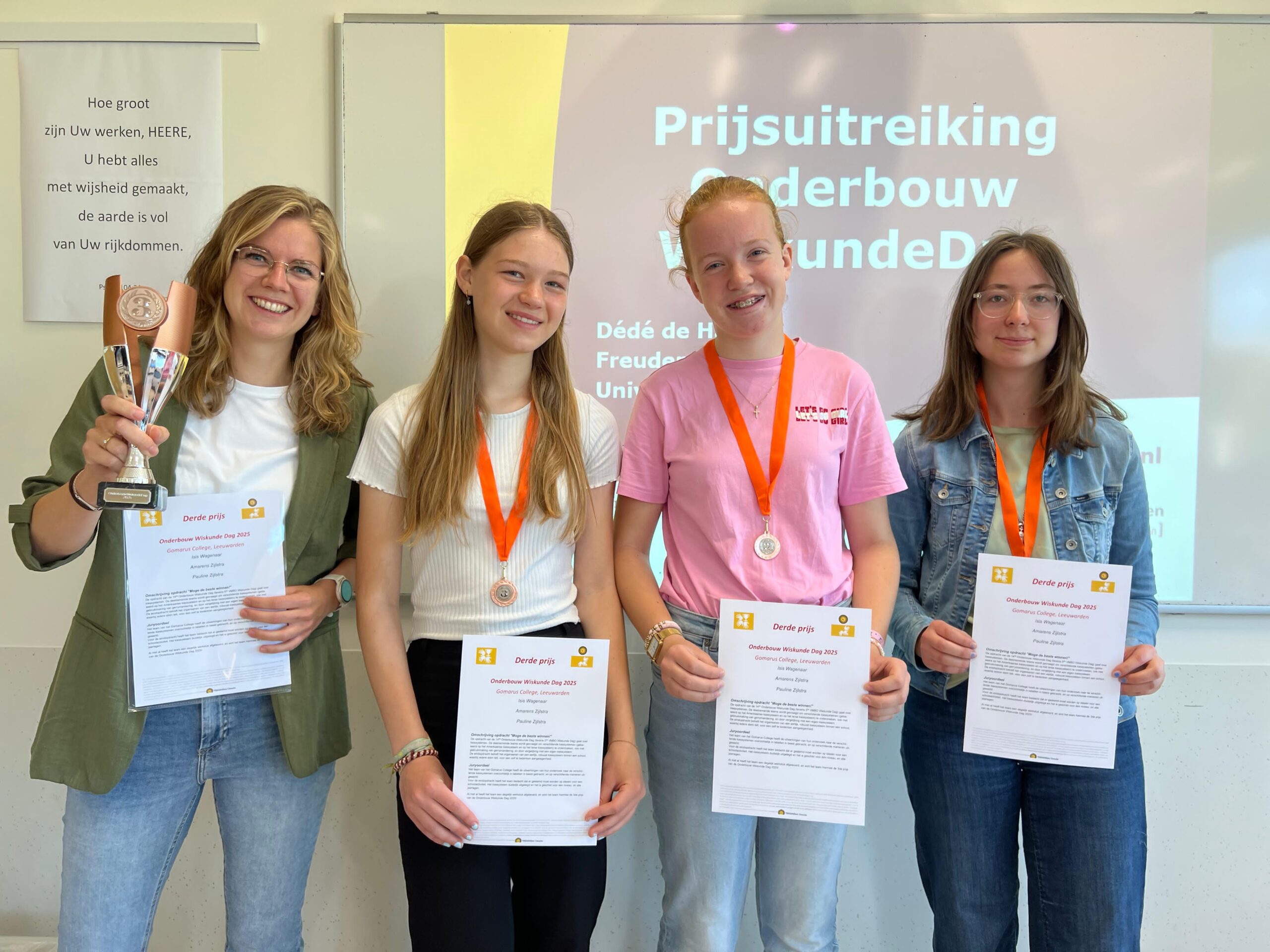 Drie vwo-leerlingen van het Gomarus College in Leeuwarden hebben een indrukwekkende prestatie geleverd tijdens de landelijke OnderbouwWiskundeDag (OWD). Isis Wagenaar, Amarens Zijlstra en Pauline Zijlstra, allen uit klas 3HV, sleepten de derde prijs in de wacht met hun creatieve en doordachte oplossing voor een complexe wiskundige opdracht over kiessystemen.