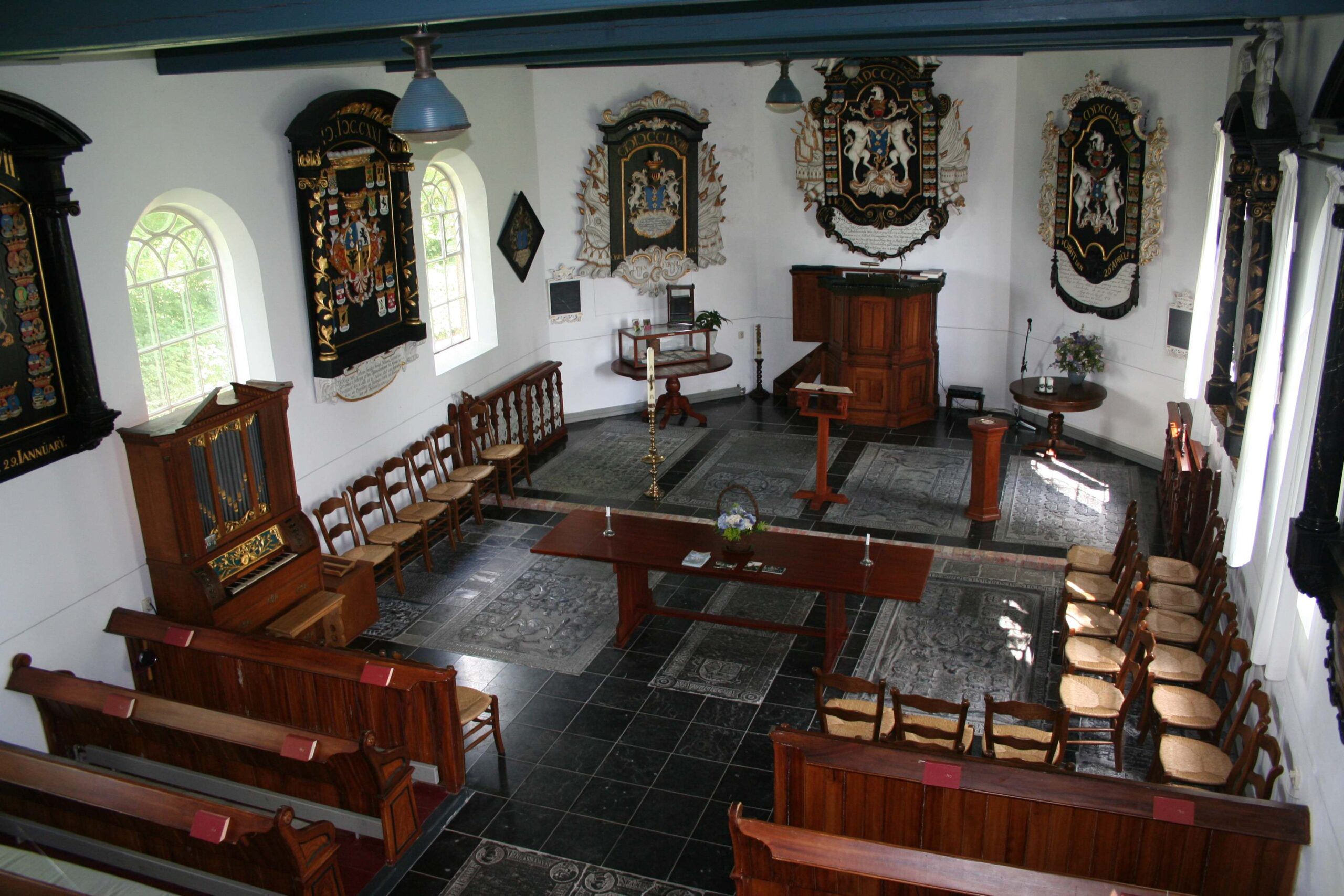 Ik wil een rondje om de kerk lopen, die is wel dicht maar ik weet dat het een grote schat aan kunstwerken bezit. De werkelijk schitterende rouwborden zijn van de adellijke familie Van Sytzama. Ze zijn, vind ik, mooier dan die in Hegebeintum. Het zijn ware kunstwerken, rijk gekleurd en geïllustreerd houtsnijwerk. Het is de enige kerk waar nog tot ver na de Franse Revolutie rouwborden werden opgehangen. En dat is uniek. Wat jammer dat dit niet méér bekend is. De familie Van Sytzama heeft nog altijd hun graven in Friens. Het kerkhof getuigt daarvan. De Sytzama’s wonen sinds 1848 al niet meer in Friens, maar de band met het dorp blijft en ze worden er nog altijd begraven.