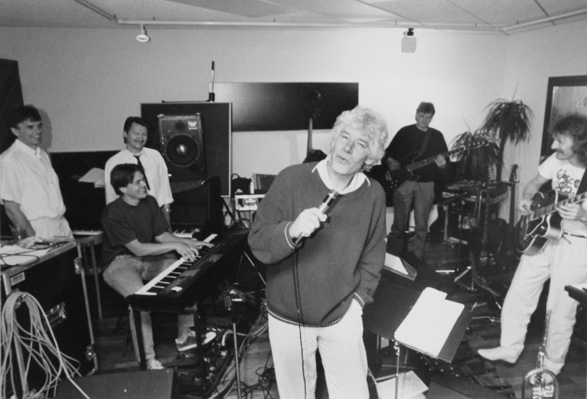 Op deze foto staan Frans Span en John Eskes rechts naast Paul van Vliet in de Telesoundstudio in de Leeuwarder Breedstraat