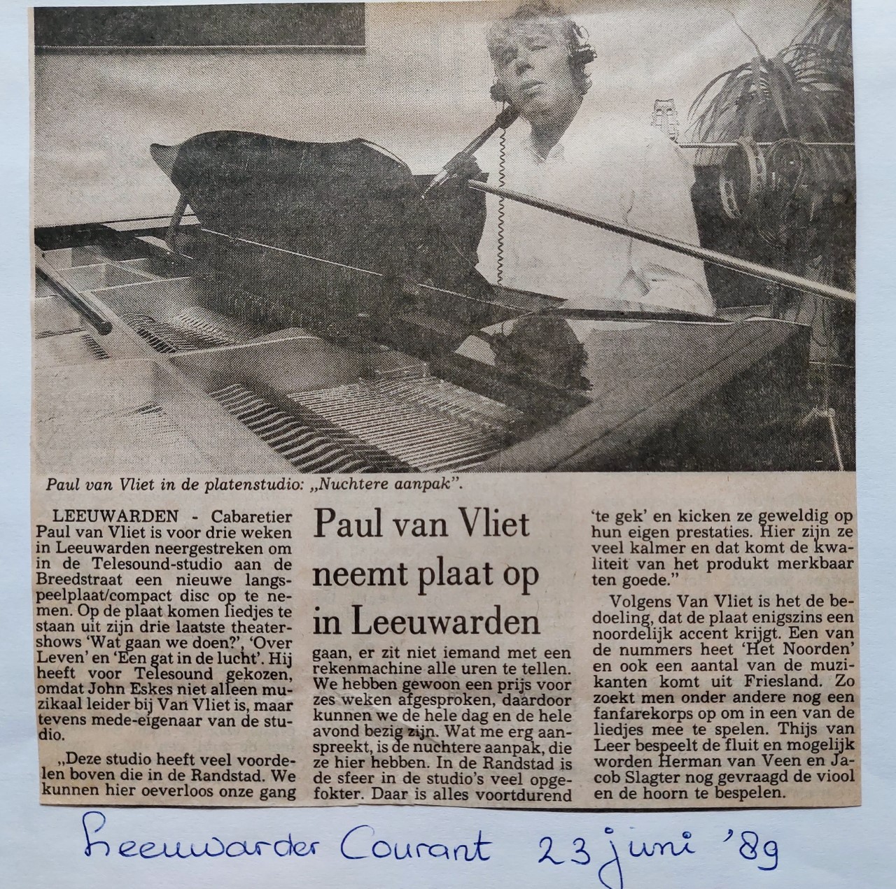 Van den Borg mailt: ‘Frans van Meerloo (ooit eigenaar van een jazzcafé in de Grote Hoogstraat in Leeuwarden) was nogal ontstemd over het feit dat er in de LC een artikel stond over Paul van Vliet, geschreven door een Groninger journalist Jacques d’Ancona. D’Ancona noemde in dat artikel alleen de Groninger begeleiders Lex Jaspers en Klaas van Dijk, geen woord over de Leeuwarder muzikanten John Eskes en Frans Span, die jarenlang deel uitmaakten van het begeleidingscombo. Ook nam Paul van Vliet in mijn Telesound Studio een cd-album op. De hele crew van Paul van Vliet was tijdens de opnameweken in hun vrije uren vaak te vinden op het terras van het jazzcafé. Het typeert weer de LC dat ze maar weer klakkeloos artikelen overnemen zonder zelf wat journalistiek onderzoek doen. “We binne hier gvd in Liwwadden, wat mut ik nou met dat Groaninger nieuws”, ik citeer even Frans van Meerloo.’