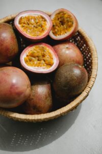 Sommige mensen noemen de smaak ’fris’, maar eigenlijk is een passievrucht gewoon hartstikke zuur. Een passievrucht is wel geneeskrachtig. In Zuid-Amerika, waar de passievrucht vandaan komt genezen ze er vrijwel alles mee; tot aan huilbaby’s toe. De passievruchten die we hier kunnen kopen zijn vaak een beetje gerimpeld, dat is niet erg. Maar als ze heel erg gerimpeld zijn, kun je ze beter laten liggen. Die zijn bijna altijd uitgedroogd.