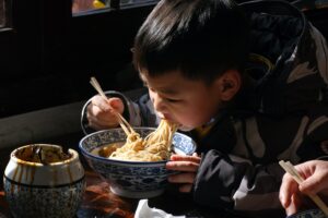 Breng de bouillon aan de kook en voeg de gesneden paksoi toe. Kook deze 1 minuut in de bouillon. Giet de bouillon in de kommen.