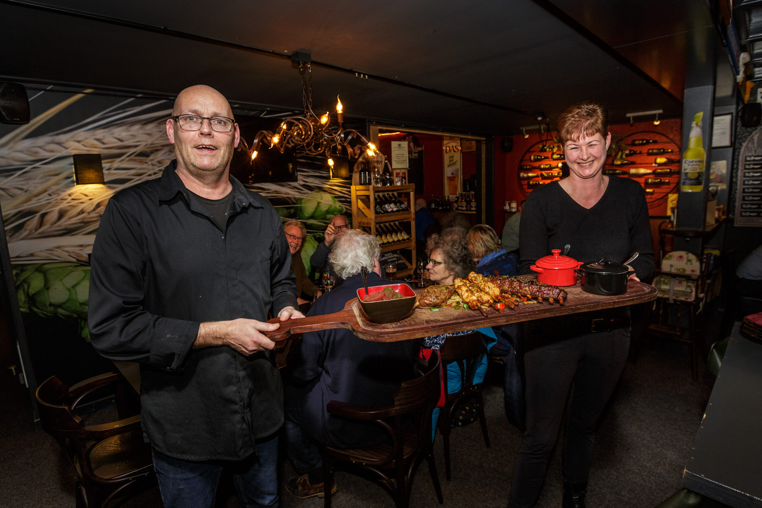Het sluiten van de snackbar betekende meer ruimte voor het eetcafé. Maaike: ‘We hebben het hele bedrijf breder getrokken en goed gekeken wat we wilden. En voor alles: we zijn gewoon gebleven. In deze kleding bedien ik aan tafel, niks geen opsmuk of tierelantijnen. We hebben een relatief kleine kaart, dat leer je, met goede producten. Neem het stoofpotje met zuurvlees, onze beenham en onze spare rib, die zijn om te zuigen. Bier en dining, delen en verdelen, is een leuk concept waar veel vraag naar is. Dan reserveren ze soms met één woord: plank. Dat is inmiddels een begrip in Kafee It Wapen fan Fryslân.’
