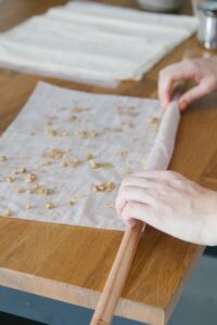 Bestrijk 1 velletje filodeeg met een kwart van de achtergehouden gesmolten boter. Leg dit op het spinaziemengsel in de pan. Duw het overhangende deeg tussen de rand van de pan en het spinaziemengsel. Herhaal dit met de overige 3 velletjes filodeeg. Bak de spinazietaart een half uur in de oven (180 graden).