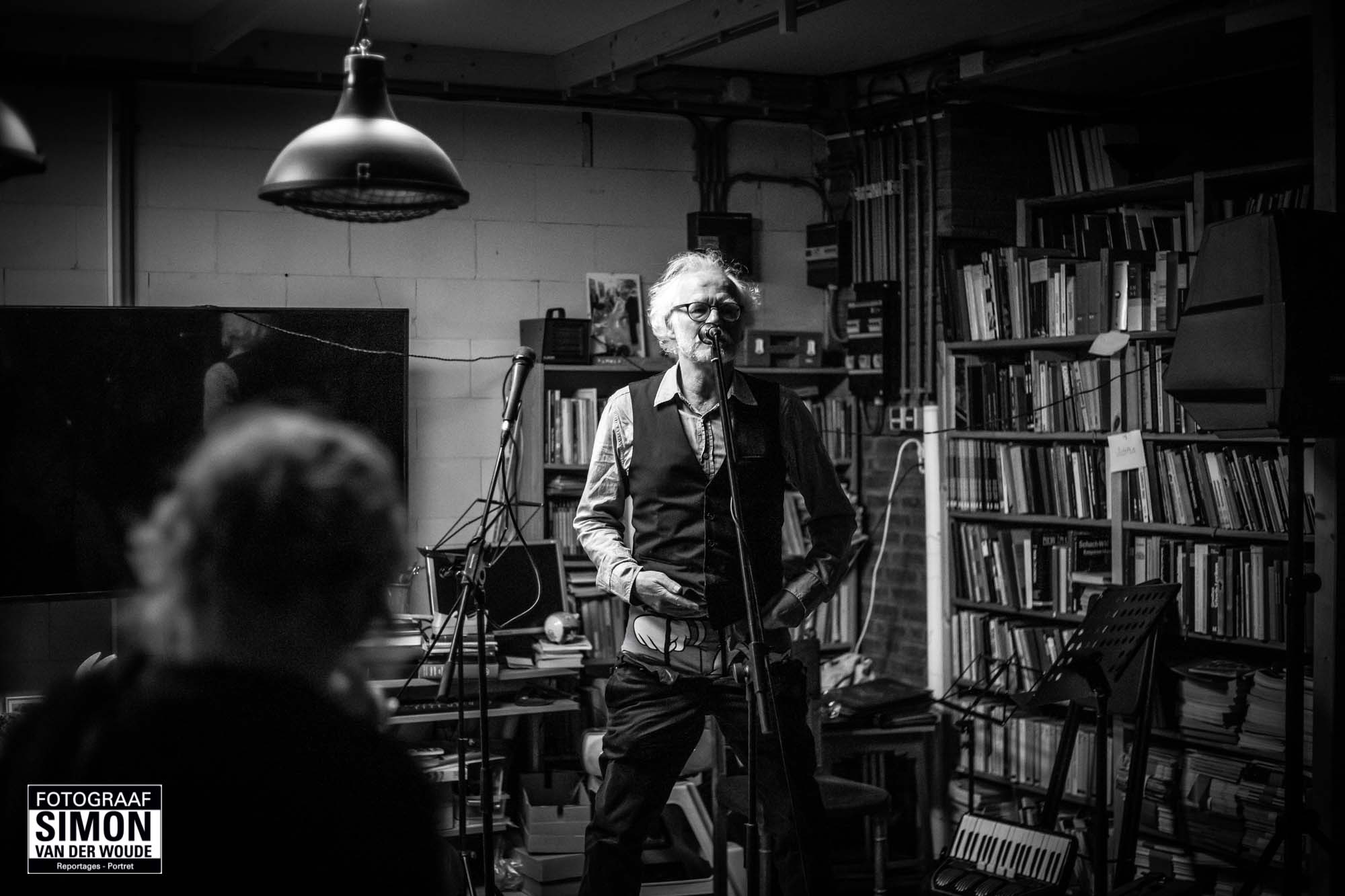 (tekst: persbericht – foto: Simon Droog van uitgeverij Perio treedt op tijdens het boekenballentje in boekenpassage De Rode Loper in de Sint Jacobsstraat; onderin Sietse de Vries)