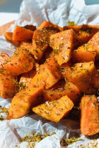 • 1 kilo zoete aardappelen, schoongeborsteld en in blokjes gesneden