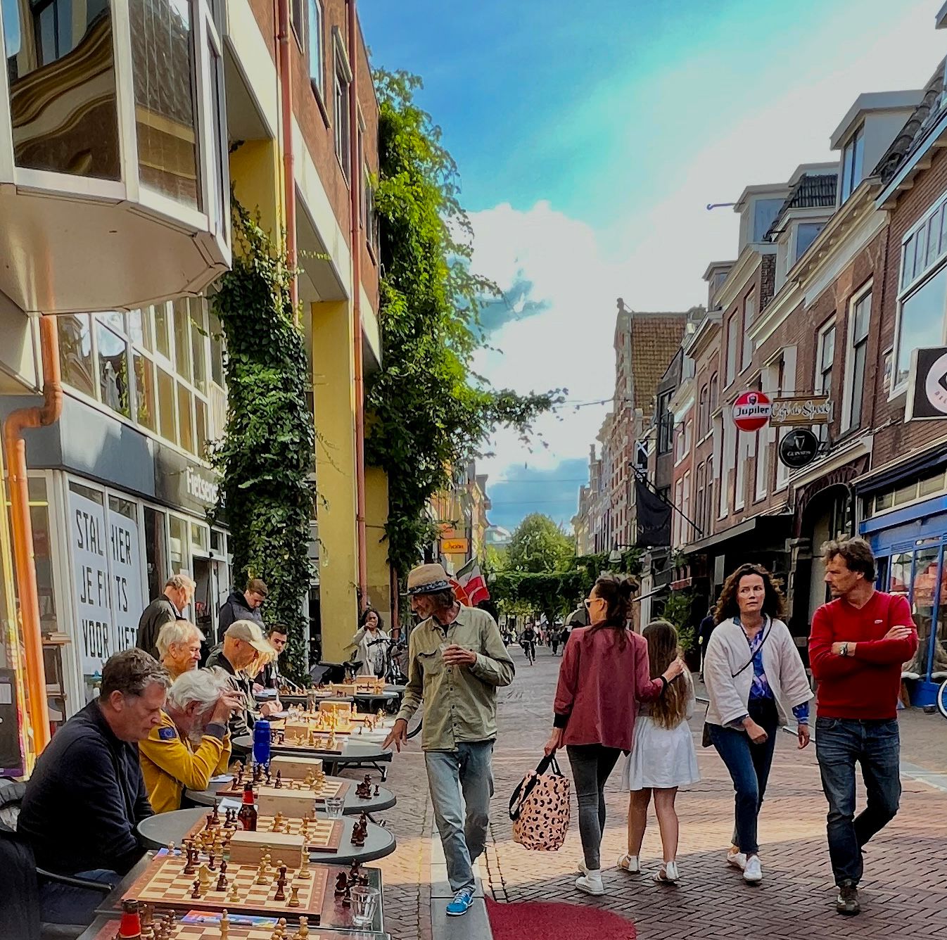 Zaterdag, 14 september 2024 – Een heerlijk zonnetje kietelt de gezichten van 12 schakers in de Sint Jacobsstraat te Leeuwarden. Wat is hier aan de hand? Manuel Bosboom is bereid gevonden het schaakseizoen van De Rode Loper te openen middels een straatschaaksimultaan. De Zaanse tovenaar (ooit winnaar van Kasparov) heeft het niet gemakkelijk maar uiteindelijk scoort hij toch 7,5 uit 12. Dolf Wissmann, Sven Broersma, Hendrik Heikamp en Richard Buurstra weten Manuel te verschalken en Wander Jorritsma dwingt remise af middels een fraai dame-offer. De wandelingetjes van Manuel langs de borden trekken veel bekijks en wie weet ontpopt dit experiment zich tot een vaste happening op de Friese schaakagenda.